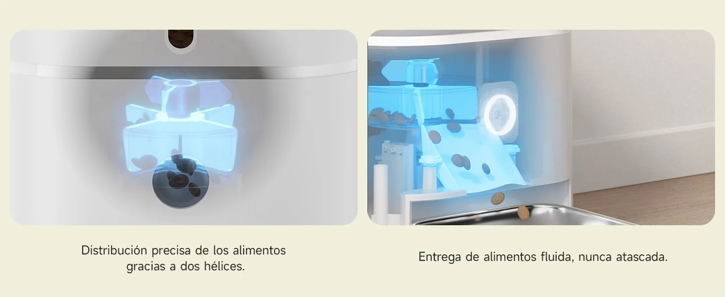 • 🍽️ Salida inclinada y rotor de seis compartimentos para evitar atascos y asegurar una alimentación fluida.
